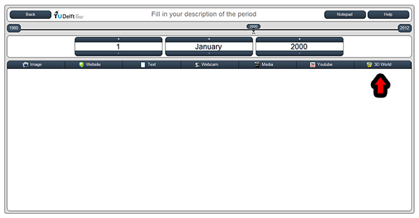 You can start the 3D World by clicking on the button 3D World from the Diary (see figure). Directly afterwards the 3D World will start and you will see the 3D World. In this screen, there are three major sections (see figure):- (1) The Object Library: at the bottom of the screen you will find a menu with which you can add objects and persons to the 3D World. This menu is split up in several tabs and subtabs to keep it conveniently arranged.